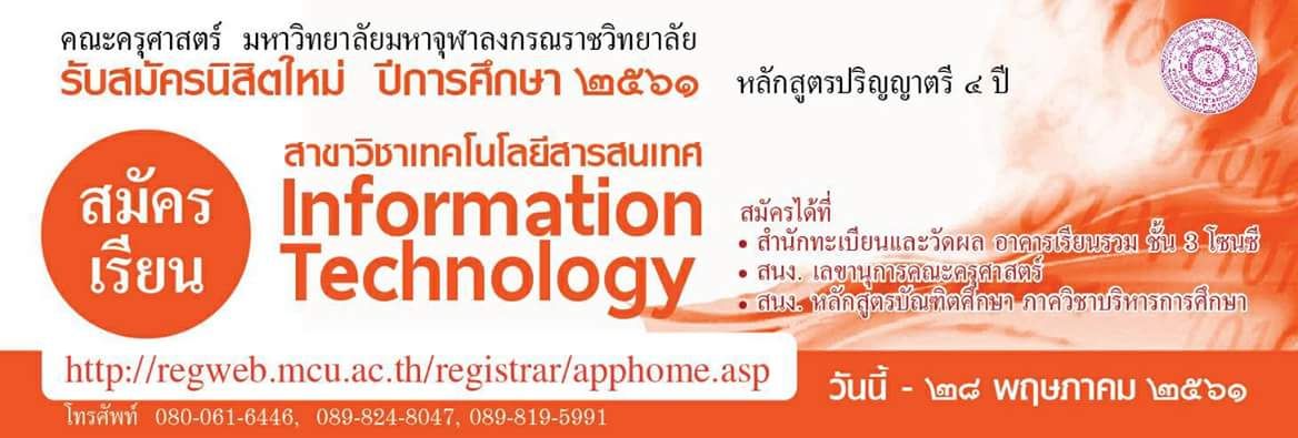 พระครูโสภณพุทธิศาสตร์ กล่าวด้วยว่า ขณะนี้สาขาวิชาเทคโนโลยีสารสนเทศกำลังเปิดรับสมัครนิสิตใหม่ ไปจนถึงวันที่ 28 พ.ค.นี้ โดยสามารถติดต่อสมัครได้ที่สำนักงานทะเบียนและวัดผล อาคารเรียนรวมชั้น 3 โซนซี สำนักงานเลขานุการคณะครุศาสตร์ และสำนักงานหลักสูตรบัณฑิตศึกษา ภาควิชาบริหารการศึกษา
