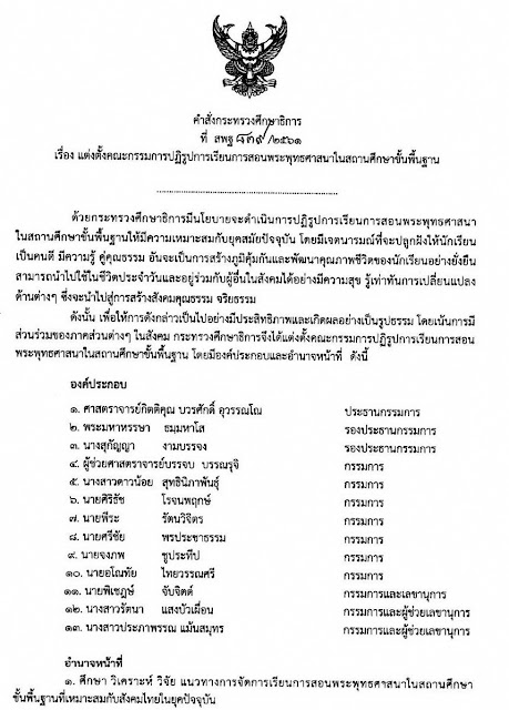 ดังนั้น เพื่อให้การดังกล่าวเป็นไปอย่างมีประสิทธิภาพและเกิดผลอย่างเป็นรูปธรรม โดยเน้นการมีส่วนร่วมของภาคส่วนต่าง ๆ ในสังคม กระทรวงศึกษาธิการจึงได้แต่งตั้งคณะกรรมการปฏิรูปการเรียนการสอนพระพุทธศาสนาในสถานศึกษาขั้นพื้นฐาน โดยมีองค์ประกอบคณะกรรมการจำนวน 13 คน คือ