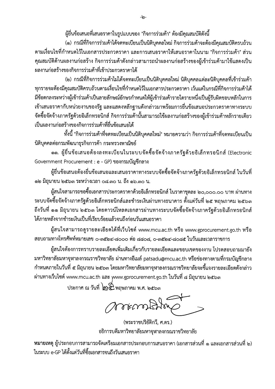 ประกาศมหาวิทยาลัยมหาจุฬาลงกรณราชวิทยาลัย เรื่อง ประกวดราคาจ้างก่อสร้างอาคารที่พักนิสิตนานาชาติ ตำบลลำไทร อำเภอวังน้อย จังหวัดพระนครศรีอยุธยา ๑ หลัง ด้วยวิธีประกวดราคาอิเล็กทรอนิกส์ (e-bidding)