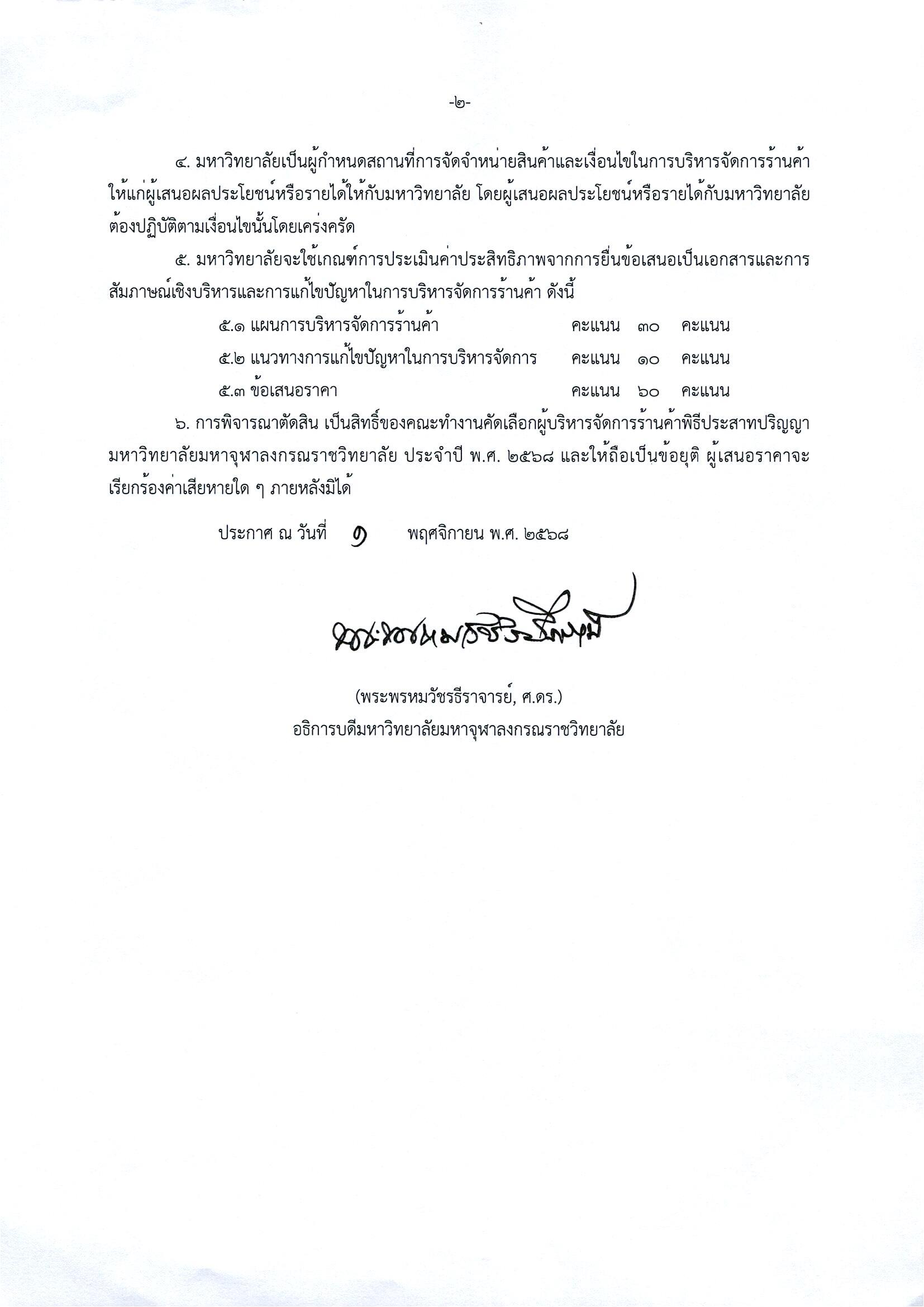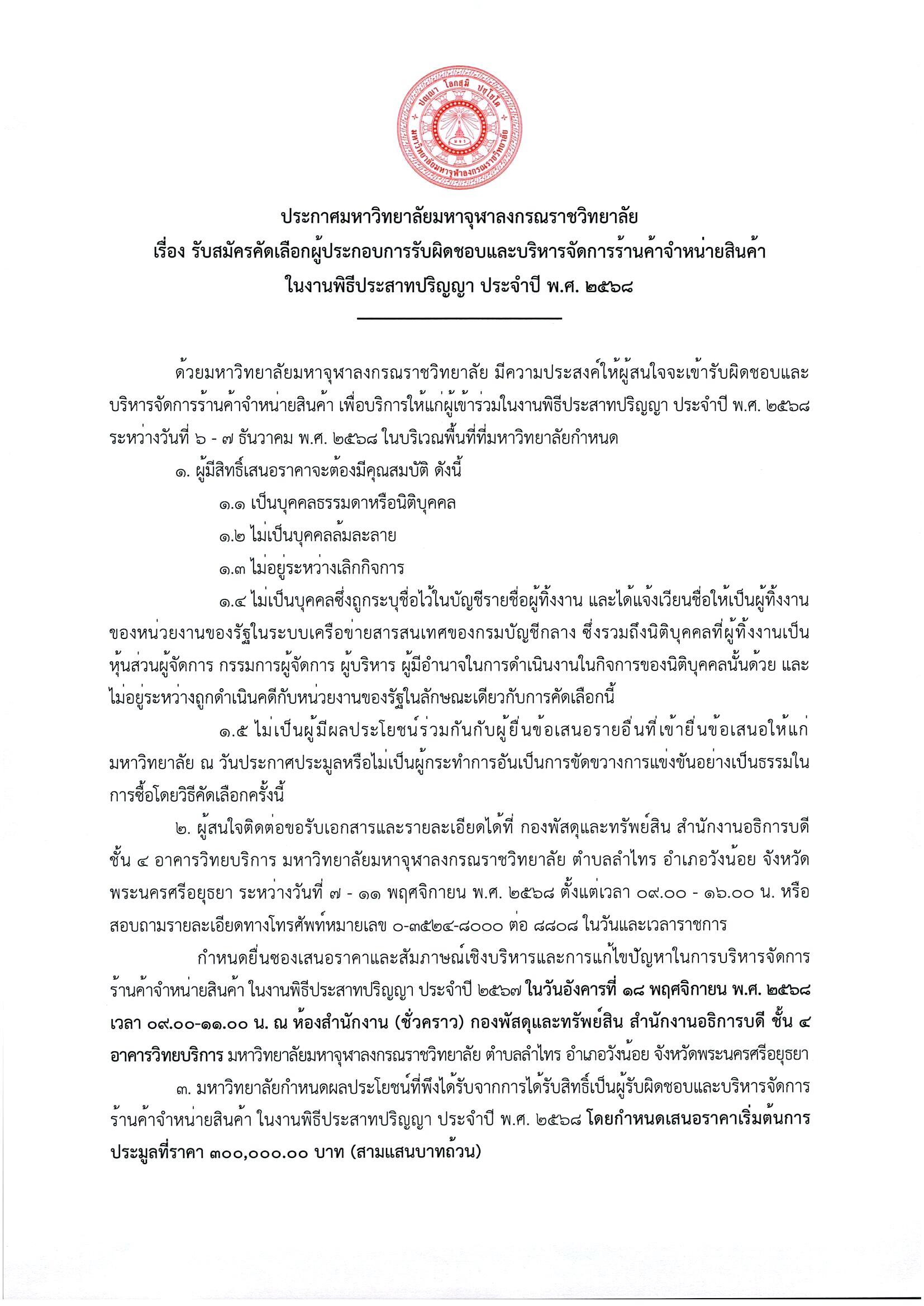 ประกาศ รับสมัครคัดเลือกผู้ประกอบการรับผิดชอบและบริหารจัดการร้านค้าจำหน่ายสินค้าในการพิธิประสาทปริญญา ประจำปี พ.ศ. ๒๕๖๘