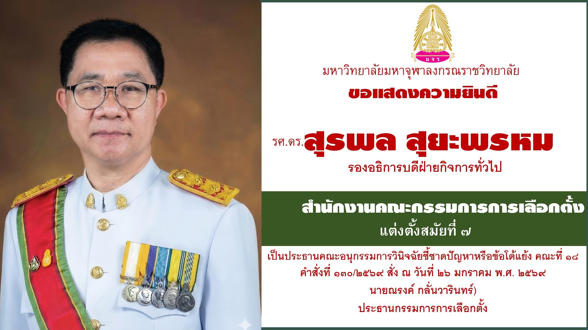 รองอธิการบดีฝ่ายกิจการทั่วไป เนื่องในโอกาสที่ได้รับการไว้วางใจและแต่งตั้งจากคณะกรรมการการเลือกตั้ง