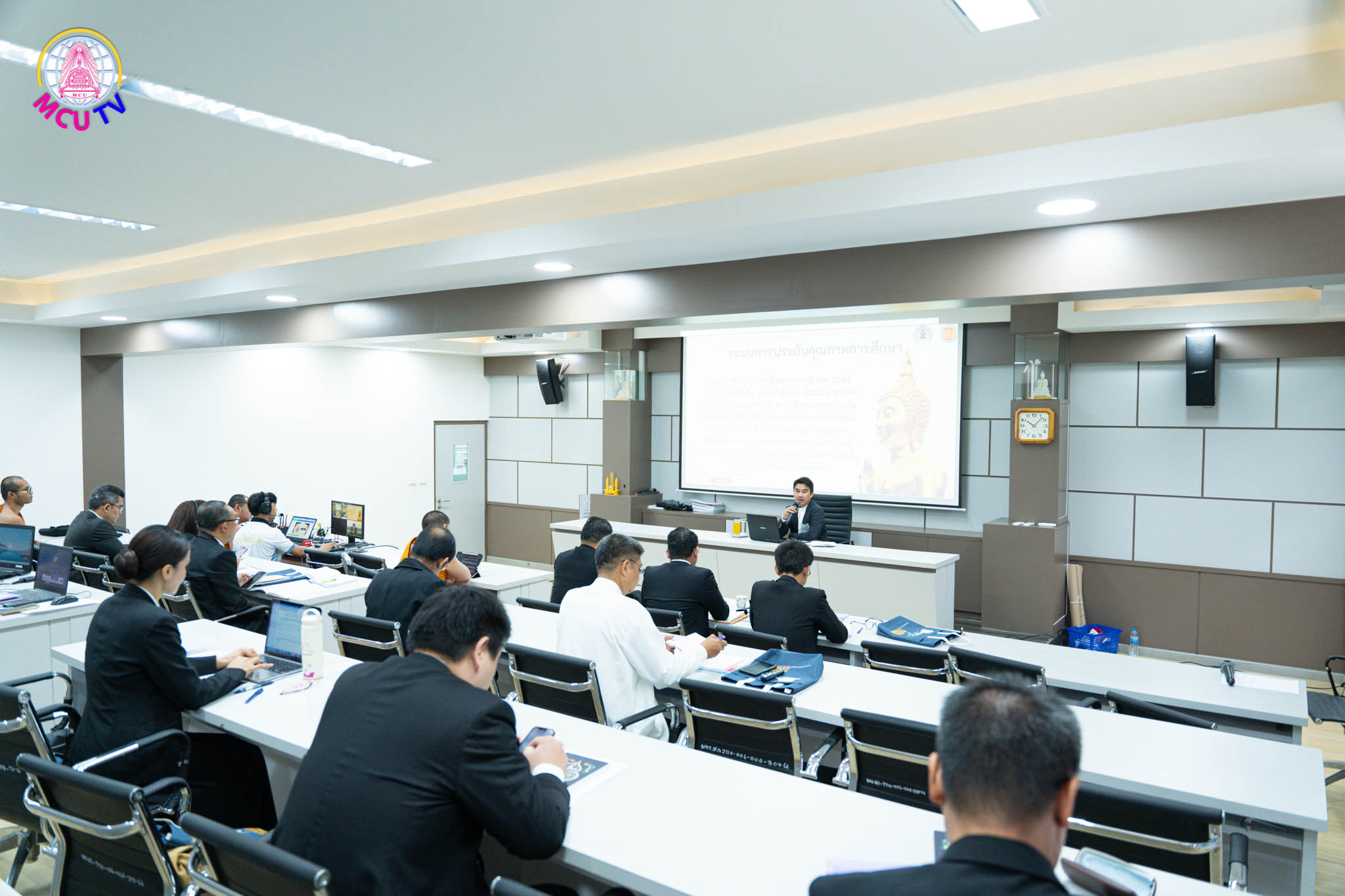 - เช้า พิธีเปิด "การอบรมผู้ประเมินสถานศึกษาอาชีวศึกษาวิถีพุทธ" โดยพระเดชพระคุณพระราชวัชรธรรมวาที, รศ.ดร. รักษาการผู้อำนวยการสำนักงานพระสอนศีลธรรม พร้อมด้วยวิทยากร จำนวน ๓ ท่าน ๑. พระปลัดไมตรี ทนฺตกาโย เจ้าอาวาสวัดโนนสมบูรณ์ ๒. รศ.ดร.วรวิทย์ นิเทศศิลป์ อาจารย์ประจำ มจร.เชียงใหม่ ๓. ผศ.ดร. รัฐพล เย็นใจมา หัวหน้าภาควิชารัฐศาสตร์ ๔. นายณัฐพงศ์ แดงหล้า ผู้อำนวยการกลุ่มประกันคุณภาพการอาชีวศึกษา สำนักมาตรฐานการอาชีวศึกษาและวิชาชีพ (สอศ.) ๕. นางสาวนารีรัตน์ ทรัพย์ประเสริฐ ผู้อำนวยการเทคโนโลยีรัตนโกสินทร์ หลังจากนั้นดำเนินการกิจกรรมกลุ่ม เพื่อฝึกฝนการเป็นผู้อบรม