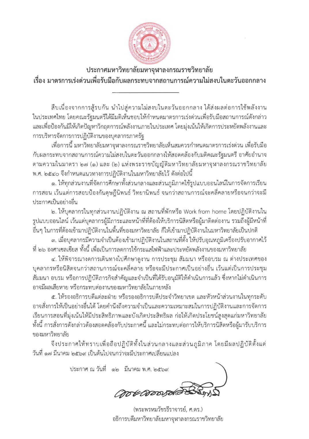 ประกาศ เรื่อง มาตรการเร่งด่วนเพื่อรับมือกับผลกระทบจากสถานการณ์ความไม่สงบในตะวันออกกลาง